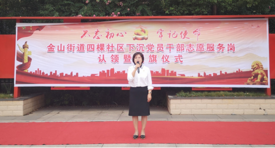 黃石高新物業(yè)公司董事長鄒丹在社區(qū)下沉黨員干部志愿服務(wù)崗認領(lǐng)暨授旗儀式上做動員講話