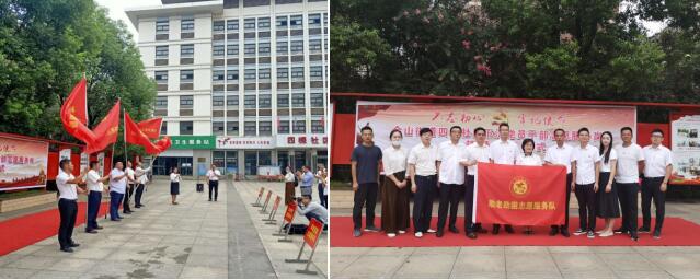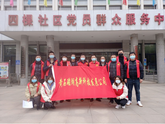 黃石高新物業(yè)公司董事長鄒丹為社區(qū)科普宣教、助老助困等5支志愿服務(wù)隊授旗并合影留念
