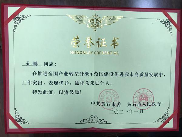 2月19日,在全市“思想破冰 引領(lǐng)發(fā)展”主題活動暨深入優(yōu)化營商環(huán)境動員大會上,中共黃石市委、黃石市人民政府發(fā)布了《關(guān)于表彰黃石市治理能力建設(shè)突出貢獻(xiàn)和促進(jìn)轉(zhuǎn)型升級推進(jìn)高質(zhì)量發(fā)展先進(jìn)集體和先進(jìn)個人的決定》。黃石經(jīng)開投項目建設(shè)管理有限公司總經(jīng)理王鵬同志榮獲“黃石市促進(jìn)轉(zhuǎn)型升級推進(jìn)高質(zhì)量發(fā)展先進(jìn)個人”稱號。