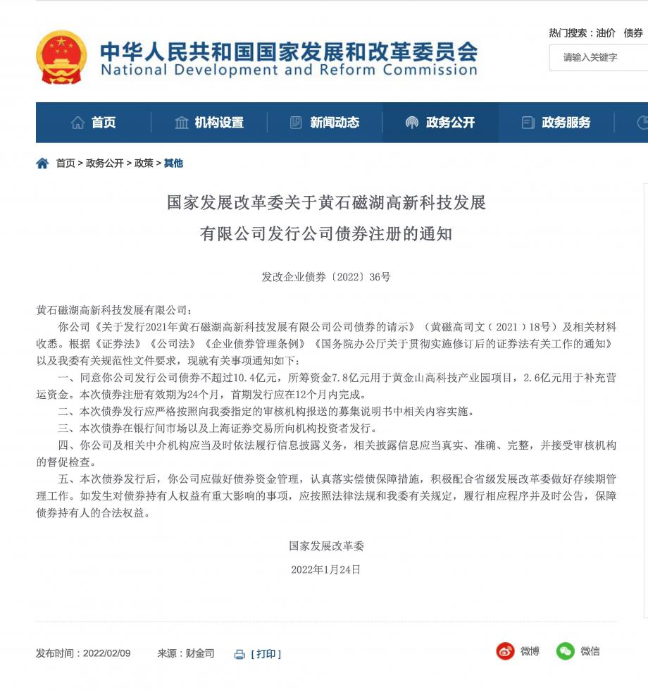 據(jù)國家發(fā)改委網(wǎng)站2月9日披露,“2021年黃石磁湖高新科技發(fā)展有限公司公司債券”已正式獲批,發(fā)行金額不超過10.4億元,募集資金將用于產(chǎn)業(yè)園區(qū)建設(shè)和營運資金補充。